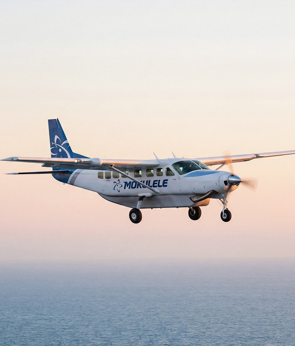 Mokulele operates a large fleet of Cessna Grand Caravans on commuter and regional routes. Every passenger enjoys both aisle access and a window, paired with expansive views that turn every flight into a front-row seat to the scenery below. -